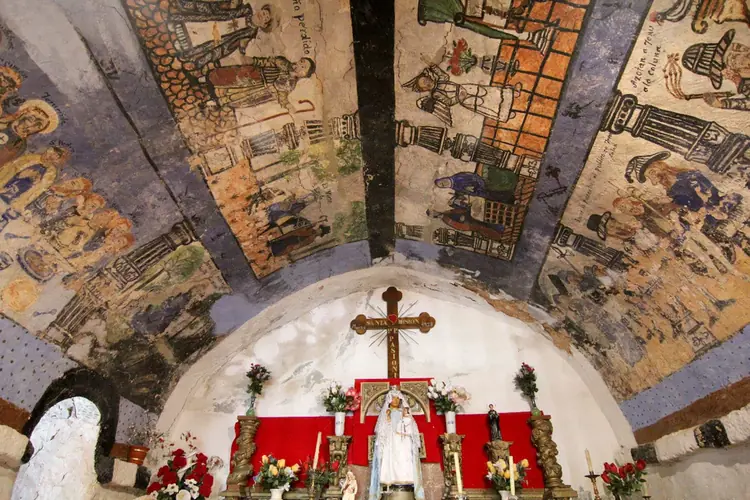 Ermitas | Quirós | Posibilidad de visita Se puede ver la pintura mural a través del cierre y de la puerta de barrotes del segundo tramo. La llave del primer acceso está en una casa del pueblo, (Araceli) Ubicación de la pintura mural Bóveda del ábside Tema Escenas del Nuevo Testamento y del cic
