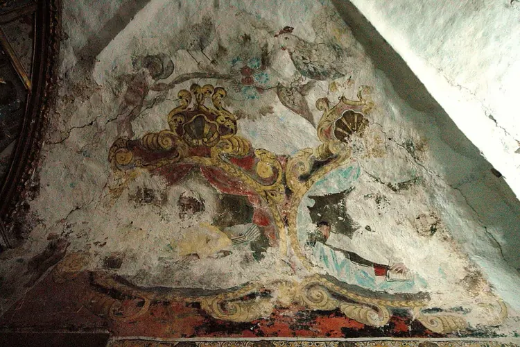 Iglesias | Proaza | Ubicación de la pintura mural Testero y bóveda de cañón del presbiterio Tema Representación de las lamentaciones por Cristo muerto, el Santo Entierro, el Colegio Apostólico. Bóveda celestial con sol, luna y la Cruz de los Ángeles Estilo Barroco popular, s.XVII