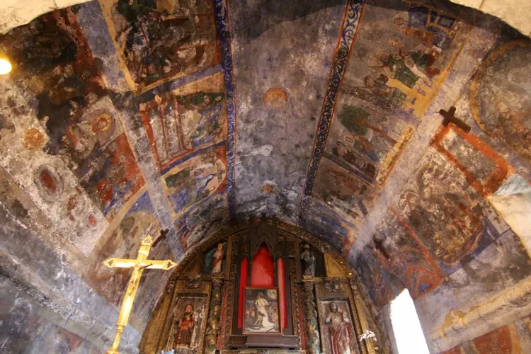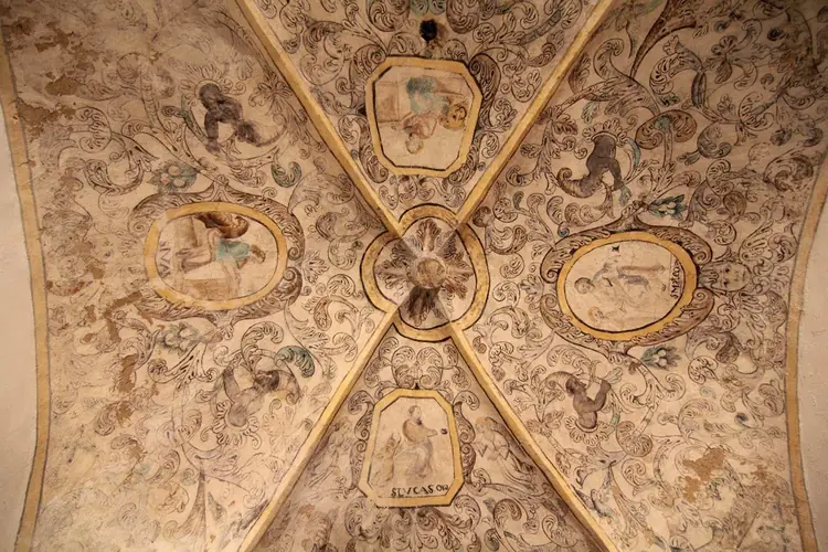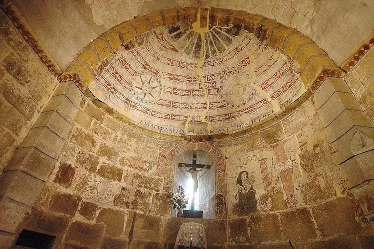Ermitas | Quirós | Posibilidad de visita Se puede ver la pintura mural a través del cierre y de la puerta de barrotes del segundo tramo. La llave del primer acceso está en una casa del pueblo, (Araceli) Ubicación de la pintura mural Bóveda del ábside Tema Escenas del Nuevo Testamento y del cic