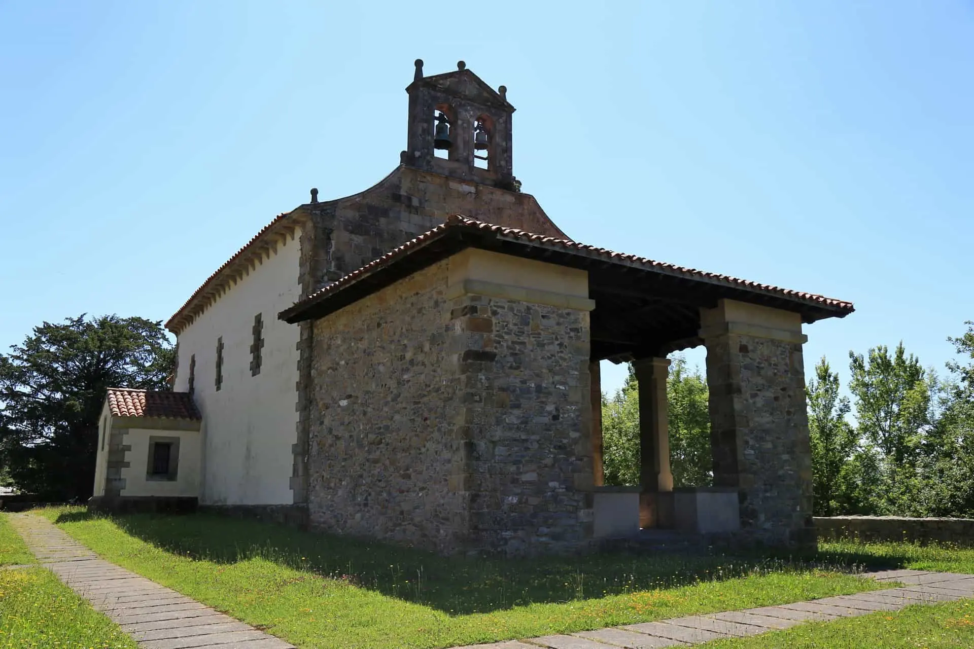 Iglesias | Sariego | Esta iglesia es un ejemplo representativo del románico rural asturiano, con planta rectangular, nave única y cabecera cuadrada, menos alta y ancha. Entre ambas hubo un arco de triunfo, hoy muy reformado, con doble arquivolta apuntada. La cubierta de la nave es de madera y la de la cabecera