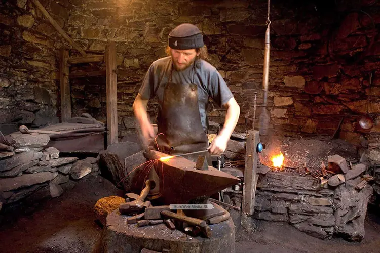 Etnográficos | Santa Eulalia de Oscos | Este conjunto se halla restaurado y rehabilitado en su integridad para la comprensión de la industria del hierro. El edificio de la ferrería se organizaba en torno a dos espacios que albergaban los ingenios hidráulicos: el mazo y los «barquines», o grandes fuelles, donde, ad